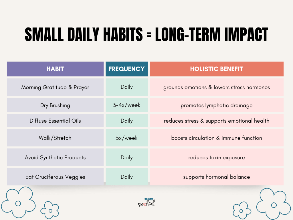 The goal isn’t to live in fear but to live aware — to nourish your body in ways that promote balance, reduce toxins, and support optimal hormone function. These are tiny, sustainable rituals that support lymphatic health, hormone balance, and lower toxic load.